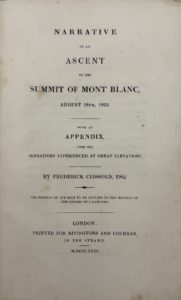 CLISSOLD (Frederick) — Narrative of an ascent to the summit of Mont-Blanc, August 18th, 1822. With an appendix upon the sensations experienced at great elevations. Londres, Rivingstones and Cochran, 1823. In-8, broché, sous couverture muette, non rogné.