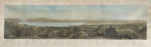 DUBOIS (Jean) — Panorama des Alpes des rives du lac Léman. Grand panorama lithographié par Himely et colorié (dimensions 128 x 42 cm), encadré (dimensions du cadre : 134 x 48 cm).