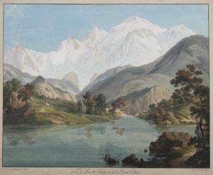LINCK (Jean-Antoine) — Vue du lac de Chède et du Mont-Blanc. Genève, chez J. A. Linck, vers 1800. Gravure au trait finement aquarellée et gouachée par Jean-Antoine Link, sous passe-partout, 50 x 39 cm (à vue).