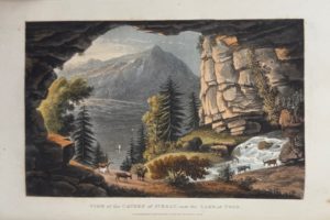 Grand in-8°, reliure plein veau glacé cerise, dos à nerfs richement orné, pièce de titre et d'année de parution, encadrement de filets et de roulette dorés sur les plats, dentelles intérieures, tranches dorées (très belle reliure moderne). Première édition anglaise, illustrée d'une carte des glaciers du canton de Berne en frontispice et de dix-sept planches gravées à l'aquatinte et coloriées : vues de Berne, Thoune, Unterseen, Interlaken, de la cascade du Staubbach, de la Jungfrau, des glaciers de Grindelwald et Rosenlaui, etc. Les vues sont extraites principalement du Voyage pittoresque dans l'Oberland bernois de Lory (1822) et du Voyage pittoresque de l'Oberland de Weibel (1812) : 1 - Bern, 2 - View near Thun, 3 - View of Thun, 4 - View of the Lake of Thun. From upper Island, 5 - The environs of Thun, 6 - View of the Castle of Spiez, 7 - View of the Cavern of St. Beat, near the Lake of Thun, 8 - View of Unterseen, 9 - View of Interlaken,10 - Fall of the Staubbach, 11 - A View of the Jungfrau, 12 - View of the Glaciers of Grindelwald, 13 - View of the Glaciers of Roselouvi, 14 - Meyringen, 15 - The Fall of Olstenbach & the Bridge of Wyler, 16 - View of the village of Brienz, 17 - View of the Castle of Rinkenberg. Le texte est composé de récits de voyage, dont un récit à la première personne de l'ascension des frères Meyer en 1812 à la Jungfrau et au Finsteraarhorn.
