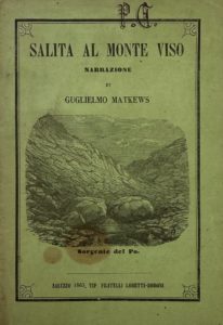 MATKEWS [sic] (William) — Salita al Monte Viso narrata dal signor Guglielmo Matkews [sic]. Saluzzo, Lobetti-Bodoni, 1863. In-8°, broché, couvertures imprimées, initiale P. C. calligraphiées sur la couverture (tache sur la couverture).