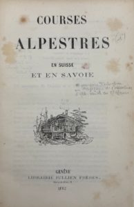 SMITH (Albert), JULLIEN (Jean), GENTIN (Léonard) et PESCHIER (Charles) — Courses alpestres en Suisse et en Savoie. Genève, Jullien Frères, 1852. In-8°, broché, couverture imprimée.