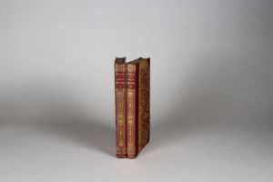 BALZAC (Honoré de). Histoire de la grandeur et de la décadence de César Birotteau, parfumeur. Paris, Chez l’éditeur, 1838. 2 volumes in-8, demi-maroquin bordeaux avec coins, filet, dos orné en long, tête dorée, couverture et dos (Champs-Stroobants sr). Édition originale. Bel exemplaire, avec la critique d’Édouard Ourliac, le prospectus des œuvres et à la fin du tome II le prospectus de la Revue britannique. Défauts au dos de la couverture.