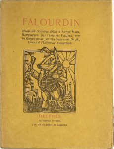 FLEURET (Fernand). Falourdin, macaronée satyrique dédiée à André Mary, bourguignon. Delphes, au Trépied pythien, l’an IIIe du Délire de Lamachus [1916]. In-12 carré, broché, couverture rempliée illustrée, non rogné, boîte de...