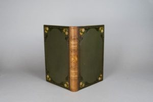 CHANSONNIER NORMAND. Préface de Joseph L’Hôpital. Paris, Aux dépens de la Société normande du Livre illustré, 1905. Grand in-8, maroquin kaki, encadrement de rameaux de pommier avec trois fruits dans les angles dans un dégradé de couleurs, dos orné de même, encadrement intérieur orné d’un double filet doré et une fleur violette dans les angles, doublure et gardes de soie moirée vert pâle, tranches dorées sur témoins, couverture, étui (Marius Michel). Recueil de chansons normandes du XIème siècle jusqu’à nos jours. Décoration en couleurs de Adolphe Giraldon. Tirage à 125 exemplaires. Exemplaire dans une belle reliure mosaïquée de Marius Michel (le dos totalement déteint), enrichi de deux pages originales sur vélin chacune accompagnée de trois pages sur calque à l’encre de chine représentant les décors des encadrements végétaux. La première page originale, dans les tons verts, est la page 9, elle illustre un Vau de Vire (XVe siècle). La seconde page originale, dans les tons lilas, illustre un lied de Henri de Régnier. Toutes ces pages sont signées des initiales de l’artiste.
