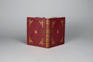 CLARETIE (Jules). Un Enlèvement au XVIIIe siècle. Documents tirés des Archives nationales. Paris, E. Dentu, 1882. In-12 carré, maroquin framboise, encadrement sur les plats dessiné par des rondins mosaïqués s’entrecroisant aux angles et des feuillages dorés dans les angles, fleuron doré au centre, dos orné, encadrement intérieur orné de doubles filets de petits fers, doublure et gardes de moire brochée, tranches peigne, couverture et dos, étui (L. Magnin rel. Lyon). Édition tirée à petit nombre, ornée d’un portrait de l’auteur et d’un frontispice. Un des quelques exemplaires sur chine, celui-ci contenant le portrait et le frontispice en triple et en double états. Charmante reliure de Lucien Magnin.