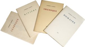 – Lespuge. Paris, LFP, 1940. In-12, en feuilles. Édition originale. Un des 100 exemplaires de tête sur vieux japon contenant un état supplémentaire du dessin de J. Thomas. Envoi autographe signé. Quelques rousseurs. – Orénoque. Paris, LFP, 1941. In-12, en feuilles. Nouvelle édition, tirée à 300 exemplaires sur vergé. Envoi autographe signé. – Rivière. S.l.n.n., 1941. In-12, en feuilles. Édition originale. Tirage à 73 exemplaires, celui-ci sur japon ancien. Envoi et poème d'une strophe autographes signés. Quelques rousseurs. – Domaine. Paris, LFP, 1942. In-12, en feuilles. Édition originale. Tirage à 165 exemplaires, celui-ci sur Ingres teinté. Envoi et poème d'une strophe autographes signés. – 5 poèmes autographes signés de Ganzo, inscrits sur un feuillet de titre volant de l'ouvrage Par Robert Ganzo.