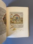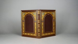 FLAUBERT (Gustave). La Légende de Saint Julien l’Hospitalier. Aux dépens de la Société normande du Livre illustré, 1906. In-4, maroquin bordeaux, plats occupés par un grand portique architectural moyenâgeux mosaïqué d’une décoration multicolore, dos orné dans le même style, doublure de maroquin beige orné de deux listels mosaïqués et de filets dorés, gardes de reps marron, tranches dorées, chemise, étui (Mercier sr de Cuzin). Fac-similé d’un manuscrit calligraphié, enluminé et historié par Malatesta. Tirage unique à 170 exemplaires sur japon. Très riche et rutilante reliure mosaïquée d’Émile Mercier.