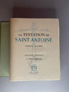 FLAUBERT (Gustave). La Tentation de Saint-Antoine. S.l., La Tradition, 1943. In-4, en feuilles, couverture rempliée, emboîtage. Première version de l’œuvre de Flaubert, ornée d’eaux-fortes originales de F. Hertenberger. Tirage à 325 exemplaires sur vélin d’Arches, celui-ci un des 100 contenant un état supplémentaire des eaux-fortes.