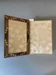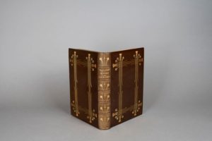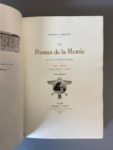 GAUTIER (Théophile). Le Roman de la momie. Paris, L. Carteret, 1901. In-8, maroquin brun, décor de huit gerbes de tiges de lotus ou fleurs mosaïquées disposées dans les angles le long des côtés, dos orné, encadrement intérieur orné de même, doublure et gardes de soie brochée beige, tranches dorées sur témoins, couverture et dos, étui (P. Ruban, 1905). 40 compositions originales d’Alexandre Lunois, gravées au burin et à l’eau-forte par Léon Boisson. Tirage à 400 exemplaires, dont 150 exemplaires de grand choix sur japon et vélin dont celui-ci. Dos passé.