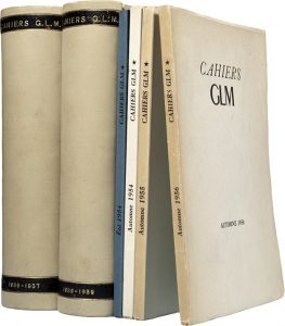 [GLM]. Cahiers GLM. Première série. Nos1-9. Paris, Guy Lévis Mano, mai 1936 - mai 1939. 9 fascicules en 2 volumes in-12, bradel demi-toile bronze à bandes, plats de papier à décor géométrique, dos lisse orné, couverture et dos....