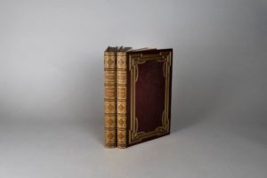 MÉRIMÉE (Prosper). Chronique du règne de Charles IX. Paris, Les Amis des Livres, 1876. 2 volumes in-8, maroquin aubergine, encadrement de deux jeux de cinq filets dorés brisés aux angles ornés d’une fleur de lis et branches de feuillage doré, dos orné de même, dentelle intérieure, tranches dorées sur témoins, couverture et dos (Mercier sr de Cuzin). 31 compositions dessinées et gravées à l’eau-forte par Edmond Morin. Tirage à 115 exemplaires sur vélin. Dos passé. Traces blanches sur les plats.