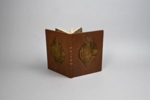 POE (Edgar). Le Roi Peste calligraphié et illustré par J. Hamman. Paris, René Kieffer, 1925. Petit in-4, maroquin marron clair façonné, cuir modelé encastré sur les plats, dos lisse titré or, tête dorée, non rogné, couverture et dos (René Kieffer). Tirage à 550 exemplaires, celui-ci sur vélin de cuve. Reliure de l'éditeur ornée sur les plats d'un cuir modelé représentant le roi Peste tenant une vanité, signé des initiales EVS.