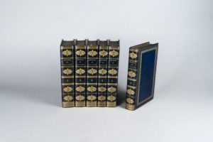 RACINE (Jean). Œuvres complètes. Avec les notes de tous les commentateurs. Édition publiée par L. Aimé-Martin. Paris, Lefèvre, 1820. 6 volumes grand in-8, maroquin bleu nuit à long grain, encadrement orné de filets et de roulettes dorés et à froid, dos orné, roulette intérieure dorée, tranches dorées (Simier R. du Roi). 14 figures gravées, non signées. Jolie reliure de Simier. Charnière supérieure du tome I habilement restaurée.