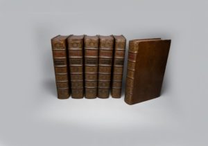 TRÉVOUX (Dictionnaire de). — Dictionnaire universel françois et latin […]. Nouvelle édition corrigée et augmentée. Nancy, Pierre Antoine, 1734. 5 volumes. — Supplément. Nancy, 1752. 2 tomes en un volume. Ensemble 6 volumes in-folio, veau fauve, double filet à froid, dos orné, pièces de titre et de tomaison, tranches rouges (Reliure de l'époque). Nouvelle édition de ce fameux dictionnaire, paru pour la première fois en 1704 à Paris. Celui-ci fut la référence majeure pour l'histoire de la langue française et de l'influence culturelle de celle-ci dans l'Europe du XVIIIe siècle. Bel exemplaire, le dos richement décoré, notamment d'un fleuron répété dans les caissons avec quatre animaux affrontés et de quatre petits soleils dans les angles de la pièce de tomaison. Reliure habilement restaurée (coiffes et parfois des mors). Mouillure sur quelques plats.