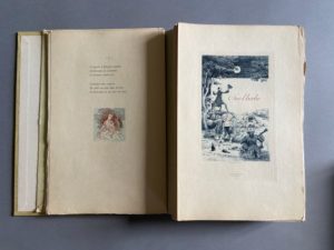 VERLAINE (Paul). Les Fêtes galantes. Paris, Ferroud, 1913. In-8, en feuilles, couverture rempliée illustrée, emboîtage. Édition illustrée de compositions originales de Léon Lebègue. Un des 25 exemplaires de tête sur japon impérial, contenant 4 états des eaux-fortes dont un état colorié par l'artiste, le tirage à part en bistre sur japon des en-têtes et culs-de-lampe, et une aquarelle originale inédite. Prospectus joint (4 pages).