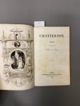 VIGNY (Alfred de). Chatterton, drame. Paris, Hippolyte Souverain, 1835. In-8, bradel percaline ocre, dos orné à froid d’un emblème, non rogné (Reliure vers 1880). Édition originale, ornée d’un frontispice d’Edmond May gravé sur acier. Exemplaire de Philippe Burty avec sa cigogne frappée au dos. De la bibliothèque Alfred Piat (ex-libris). Dos foncé, piqûres sur les plats. Rousseurs.