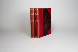 VIGNY (Alfred de). Cinq-Mars ou une conjuration sous Louis XIII. Paris, Maison Quantin, 1889. 2 volumes in-4, demi-maroquin rouge avec coins, filet, dos orné en long, tête dorée, non rogné, couverture et dos (V. Champs). Portrait et 10 illustrations de A. Dawant, gravées par Gaujean. Édition en grand format tirée à 50 exemplaires sur japon, avec trois suites des planches dont l’eau-forte pure. De la Collection Alphonse Lemerre des chefs-d’œuvre du roman contemporain.
