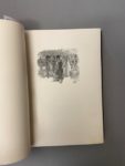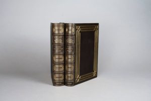 VIGNY (Alfred de). Servitude et grandeur militaires. Paris, Édouard Pelletan, 1898. 2 volumes in-8, maroquin aubergine, large encadrement composé de trois jeux de cinq filets dorés entrecroisés aux angles, dos orné de jeux de filets dorés, encadrement intérieur orné d’un jeu de quatre filets et filets perlés, doublure et gardes de soie brochée gris clair, tranches dorées sur témoins, couverture et dos, étuis (P. Ruban, 1892). Dos passé. 51 et 84 illustrations de Louis Dunki, gravées sur bois par Clément Bellenger. Tirage à 350 exemplaires, celui-ci comportant une suite sur chine de tous les bois. Quelques rares piqûres sur les tranches et sur un feuillet. Dos très légèrement passé.