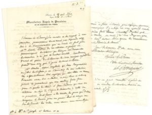 Alexandre BRONGNIART (1770-1847). 17 L.A.S., Sèvres 1832-1833, au baron de Saint- Joseph ; 29 pages in-4° ou in-8°, la plupart à en-tête Manufacture Royale de Porcelaine de Sèvres, une adresse Correspondance concernant un service de table, commandé par les frères Pastré de Marseille pour le Vice-Roi d'Égypte Mehemet Ali : commande, échantillons, livraison, emballage, expédition... JOINT : le mémoire de la commande, signé par Brongniart et Pastré frères (22 décembre 1832), le détail du supplément, la facture acquittée, et 2 lettres jointes.
