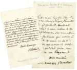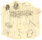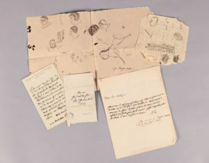 Benjamin CONSTANT (1767-1830). 3 L.A.S., 1828-1830 et s. d., à Amédée Girod de l'Ain, et un manuscrit autographe avec dessins ; 2 pages in-8° et demi-page in-4°, adresses, et un feuillet in-8 (bords déchirés) [Vers 1815], il avait oublié un dîner ; ne voulant pas faire attendre son correspondant, il passera le voir chez lui le lendemain. - 24 avril 1828, le priant d'écouter M. Caquelard, «excellent électeur & ami intime de M. de Schonen, sur une affaire très facheuse qui arrive à un de ses amis»... - 29 juillet 1830 au matin. «Je suis venu ici après une opération de la vessie ne pouvant pas marcher & j'ai été forcé de m'arrêter ici. Ne pourriez vous pas me faire l'extrême plaisir de venir me voir. Ce serait un service pour toute ma vie. Je suis impatient de me réunir à vous ni plus ni moins» (une note indique qu'il est chez M. Cassin, rue Taranne). Brouillon de notes pour un discours en 1817 : «Pas d'accusation sur les pairs mais simplement d'un meurtre rétractée / déclaré calomniateur / Dissolution des Députés) à cause de l'opposition grossissant / espérance d'avoir une chambre à lui / fraudes électorales»... Etc. Dans les marges et au dos, 8 dessins à la plume de têtes. JOINT : une feuille in-fol. avec des comptes et une dizaine de dessins à la plume : têtes et un cheval.