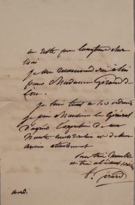 François GÉRARD (1770-1837). L.A.S., mardi [1826], au général O'Connor ; 2 pages in-8°. Au sujet de son portrait du général Foy «Je n'ai point oublié que le Général O'Connor a bien voulu me demander de voir le Portrait du Gl Foy, dès qu'il serait montrable. Je viens de le terminer, et je m'empresse d'en prévenir le Général, en le priant de me faire la grâce de venir le plus tôt qu'il pourra, ayant lieu de craindre que le tableau ne reste pas longtems chez moi»...