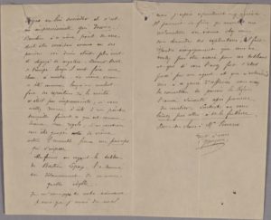 Paul GAUGUIN (1848-1903). L.A.S., [début mai 1883], à Camille Pissarro ; 2 pages et demie petit in-8° remplies d'une petite écriture (légère déchirure) Quelques jours après l'enterrement de Manet. Il a appris qu'il y avait eu une souscription à laquelle tous ont participé, «pour envoyer une couronne à l'enterrement de Manet, vous me direz ce que je vous dois. J'ai si peu de temps à moi pour travailler que je n'ai pas voulu sacrifier le jeudi [3 mai, date de l'enterrement], et j'ai été travailler à Chaville». De plus il ne voulait pas affronter la foule des curieux : «beaucoup de ses détracteurs durant son vivant ont été pour se faire voir, croyant augmenter leur célébrité et voulant se faire citer par les journaux. [...] Manet avait endossé l'uniforme de chef, maintenant qu'il est mort Degas va lui succéder, et c'est un impressionniste qui dessine ! Boudin, à ce même point de vue, doit être considéré comme des premiers, son dessin était plus écrit et dégagé de mystère»... Quant à l'exposition de Londres [la 1ère exposition impressionniste de Londres, Dowdeswell Galery, 1883, Drawings, paintings, and pastels by members of La Société des Impressionistes, organisée par Durand-Ruel], il pense que Durand-Ruel se trompe : «La même erreur a été commise, lorsqu'on voulait faire des expositions où la moitié n'était pas impressionniste. Si vous mettez Cézanne à côté d'un peintre tranquille faisant ce qui est connu, Cézanne sera rigolo. Si, au contraire, vous êtes groupés, de même nature, l'ensemble forme un principe qui s'impose. Ma femme, en voyant le tableau de Bastien-Lepage, l'a nommé un détournement de mineure. Quelle idylle»... Gauguin tente d'aider Pissarro, qui a fait assurer ses tableaux, à faire annuler cette souscription : «Il faut répondre énergiquement que vous ne voulez pas être assuré pour vos tableaux et que si vous l'aviez fait, c'était pressé par un agent et que, n'entendant rien à ce genre d'affaire, vous aviez la conviction de pouvoir la défaire l'année suivante, après promesse du courtier. Surtout, ne vous laissez pas aller à la faiblesse»... Provenance : Archives de Camille Pissarro (vente 21 novembre 1975, n° 51).