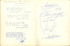 [LIVRE d'OR]. Livre d'or du restaurant Le Galan, Paris IVe 1959[-1979] ; 23 pages d'un volume in-4° relié box noir Restaurant gastronomique situé Boulevard Henri IV près de la Bastille. Plus de 80 signatures, pensées et dessins d'artistes, écrivains, vedettes et autres personnalités... • Marc Chagall (dessin d'une tête, qu'il a signé Matisse puis Picasso avant de biffer ces signatures et de signer «Marc Chagall 1959»), et • Alexandre Arnoux, • Pierre Balmain (dessin), • Raymond Bernard, • Germaine Beaumont, • Simone de Beauvoir, • Michel Ciry (dessin), • Bruno Coquatrix, • René-Louis Doyon, • Maurice Garçon, • André Gillois, • Marek Halter (avec dessin), • Auguste Le Breton, • Jean Marin, • Jean Nohain, • Francis Poulenc (avec 5 mesures des Biches), • Jean- Paul Sartre, • Jean Weber, • Claude Weisbuch (dessin), etc.