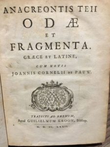 [ANACRÉON]. Anacreontis teii Odæ [Carmina] et Fragmenta, græce et latine. Cum notis Joannis …
