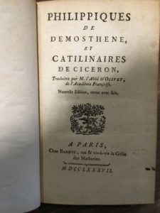 DÉMOSTHÈNE & CICÉRON. Philippiques [...] et Catilinaires. Traduite par M. l'Abbé d'Olive t. A …