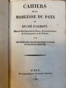 [NOBLESSE - RÉVOLUTION]. Cahiers de la noblesse du pays et duché d'Albret, dans les Sénéchaussées de Nerac, de Casteljaloux, de Castelmoron et de Tartas ; avec les noms des gentilshommes votans et de leurs députés. A Dax, De l'Imprimerie de René Leclerc, 1789. In-8°, cartonnage beige, double filet doré et roulette dentelée à froid encadrant les plats, dos lisse orné (reliure de l'époque). 46 pp. + 1 f. de Table. 2 ff. extraits du Journal de Paris (n° 129, Samedi 9 mai 1789), ont été repliés et reliés in fine.