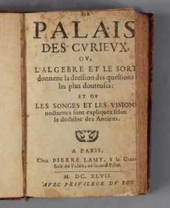 [VULSON de La COLOMBIÈRE (Marc)]. • Le Palais des curieux, ou, l'algebre et le sort donnent la decision des questions les plus douteuses : et ou les songes et les visions nocturnes sont expliquez selon la doctrine des Anciens. •• Traité des songes et des visions nocturnes, selon la doctrine des Anciens, & de leurs significations. A Paris, Chez Pierre Lamy, 1647. 2 ouvrages en un volume in-16, veau, dos lisse orné (reliure de l'époque). • à5, A-D8 & •• A-N8, O1. • à6 [à1 ou à2 en déficit], A-D8 & •• A-N8, O2 [O2 en déficit]. Une figure au feuillet A5. Manque le faux-titre et un feuillet in fine. Exemplaire court de marge avec manque au texte ; restaurations anciennes au titre, à quelques feuillets et à la reliure ; quelques rousseurs.