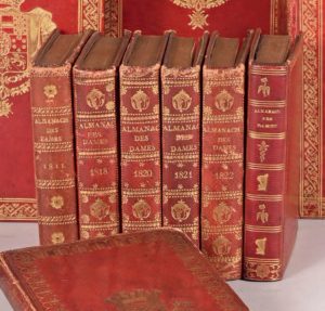 [ALMANACH]. • Almanach des Dames. Pour l'An 1811. • [...] pour l'An 1816. • [...] pour l'An 1818. • [...] pour l'An 1820. • [...] pour l'An 1821. • [...] pour l'An 1822. A Tubingue, Chez J.-G. Cotta, Libraire & A Paris, Chez Treuttel & Wurtz, Libraires, s. d. [1811 à 1822]. 6 volumes in-16, maroquin rouge, fine roulette dentelée dorée encadrant les plats, petit fleuron aux angles, dos lisse orné, tranches dorées (reliure de l'époque). Une vignette sur le titre et huit planches gravées dont deux portraits, dans chaque volume. Manque une planche et son texte (1820) ; un volume légèrement dépareillé (1811) ; un dos passé et frotté (1816) ; quelques rousseurs. ENSEMBLE SIX VOLUMES EN MAROQUIN ROUGE.