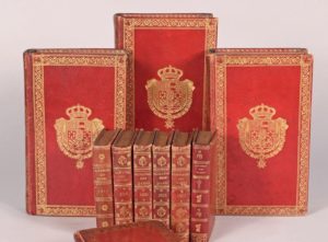 [DIPLOMATIQUE]. Négociations diplomatiques et politiques du Président Jeannin, ambassadeur et ministre de France sous François Ier., Henri IV et Louis XIII inclusivement. A Paris, Chez Petit, Libraire & A. Boucher, Imprimeur, 1819. 3 volumes in-8°, maroquin rouge à grain long, large roulette dentelée dorée encadrant les plats, armoiries au centre, dos lisse orné, tranches dorées (Zezzio, relieur, breveté de S.A.S. la Duchesse douairière d'Orléans.) «Nouvelle Édition». Portrait du Président Jeannin en frontispice du tome I. Dos légèrement terni ; quelques rousseurs mais, TRÈS BEL EXEMPLAIRE EN MAROQUIN ROUGE AUX ARMES de FERDINAND VII (1784-1833), roi d'Espagne en 1808, puis à partir de 1814.