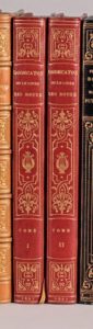 [DODECATON - SAND, MÉRIMÉE, VIGNY, MUSSET, STENDHAL, DUMAS, &c]. Dodecaton ou le Livre des douze. Paris, Victor Magen, Éditeur, 1837. 2 volumes in-8°, demimaroquin rouge à coins, filet doré bordant les plats, dos lisse orné, tête dorée, non rogné, couverture illustrée conservée (V. Champs). ÉDITION ORIGINALE COLLECTIVE composée de textes par • [Auguste BARBIER] («Beata»), • DUFONGERAY («Souvenirs d'un soldat»), • Alexandre DUMAS («Scènes historiques»), • Léon GOZLAN («Rog»), • Jules JANIN («Mon voyage à Brindes»), • Adolphe LOÈVE-VEIMARS («Belphégor»), • Prosper MÉRIMÉE («Les Âmes du Purgatoire»), • Alfred de MUSSET («Faire sans dire»), • George SAND («Le Dieu inconnu»), • Émile SOUVESTRE («Un dernier amour»), • STENDHAL («Le Philtre»), • Alfred de VIGNY («Quitte pour la peur»). Exemplaire sur vergé bien complet du catalogue (II ff.) in fine du tome II. Ex-libris manuscrit sur les titres, lavés avec légère mouillure.