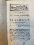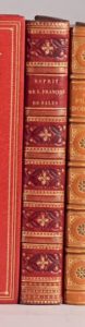 [FRANÇOIS de SALES]. P. C. L'Esprit de Saint François de Sales, évêque et prince de Genève [...]. A Lyon, Chez Rusand, Imprimeur-Libraire, 1816. In-8°, maroquin rouge à grain long, large encadrement de filets et roulettes dentelées dorés et estampés à froid ornant les plats, dos à nerfs orné, tranches dorées (reliure de l'époque) «Nouvelle Édition.» Ex-dono en page de garde : «Souvenir d'Elisabeth des Ligneries morte à 21 ans [...] comblée de tous les avantages [...] modèle de toutes les vertus.» Trace de mouillure sur le premier plat.