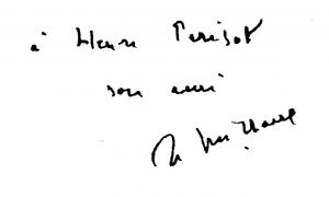 Édition originale. Tirage unique à 100 exemplaires sur vélin d'Arches (celui-ci n'a pas été numéroté). Envoi autographe signé à l'éditeur Henri Parisot (1908-1979). Proche des surréalistes, celui-ci dirigea la collection L'Âge d'or aux Éditions de la revue Fontaine puis chez Flammarion ; il demeure célèbre pour ses traductions de Lewis Carroll, mais aussi d'Edgar Poe, Nathaniel Hawthorne, Leonora Carrington et Lytton Strachey. Tel que paru.