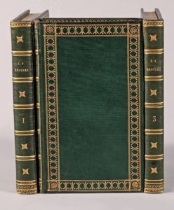 La BRUYÈRE (Jean de). Les Caractères. Paris, Stéréotype d'Herhan, X - 1802. 3 volumes in-12, maroquin vert à grain long, roulette dentelée dorée encadrant les plats, dos à nerfs orné, tranches dorées (Relié par Simier) Un portrait de l'auteur gravé par Augustin de SAINT-AUBIN (t. I) et un portrait de Théophraste (t. III). De la bibliothèque Léonce Dupont de St Ouen, avec ex-libris. Dos très légèrement passés ; légères rousseurs. BEL EXEMPLAIRE EN MAROQUIN.