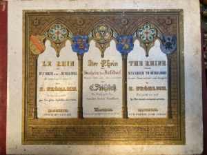 [RHIN]. FRÖHLICH (E.). Der Rhein von Mannheim bis Düsseldorf. Mannheim, Verlag und Eigenthum von Guido Zeiler, s. d. [1848]. In-8° oblong, demi-percaline rouge, large décor en couleurs avec titre ornant les plats, dos lisse orné (cartonnage de l'éditeur). Un titre orné en couleurs, trilingue, comme sur la couverture et 24 planches gravées d'après E. FRÖHLICH. Rousseurs ; salissures au premier plat. Engelmann, 824.