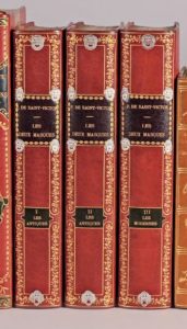 SAINT-VICTOR (Paul de). • Les Deux masques. Tragédie - Comédie [...] Première série. Les Antiques. I. Eschyle. •• [...] Les Antiques. II. Sophocle, Euripide, Aristophane, Calidasa. ••• [...] III. Les Modernes. Shakespeare - Le Théatre français depuis ses origines jusqu'a Beaumarchais. Paris, Calmann Lévy, Éditeur, 1880, 1882 & 1884. 3 volumes in-8°, demi-maroquin rouge à coins, roulette dentelée dorée bordant les plats, dos lisse orné de fers argentés personnalisés, tête dorée, non rogné, couverture conservée (Ch. Meunier) ÉDITION ORIGINALE. Dos légèrement assombris ; quelques légères rousseurs. Vicaire, VII, 110. BEL EXEMPLAIRE DANS UNE RELIURE DE CHARLES MEUNIER.