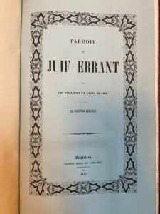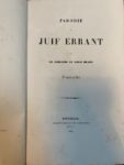 SÜE (Eugène). Le Juif errant. Paris, Paulin, Libraire-Éditeur, 1845. 4 volumes in-4°, demimaroquin bleu à coins, double filet doré bordant les plats, dos à nerfs orné, tête dorée, couvertures illustrées conservées (reliure fin XIXe s.). Illustrations par GAVARNI. Ex-libris non identifié. Carte repliée en déficit ; couverture du tome I remplacée par une autre couverture du tome IV, avec carton. Dos assombris ; quelques nerfs frottés ; rousseurs. JOINT : PHILIPON (Ch.) & HUART (Louis). Parodie du Juif errant. Bruxelles, Société Belge de Librairie, 1845. In-8° bradel, demi-percaline bleu, dos orné, couverture conservée (reliure fin XIXe s.).300 vignettes par CHAM. Quelques rousseurs. ENSEMBLE CINQ VOLUMES.