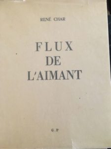 CHAR (René). Flux de l'aimant. S. l., Gaston Puel, n. d. [1965]. In-12 carré, br. Deuxième édition. Tiré à 350 exemplaires, celui-ci (n° 236), un des300 sur offset licorne.