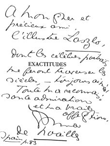 Édition originale. Un des 25 exemplaires réimposés au format in-4 sur japon impérial. Envoi autographe signé au peintre Philip Alexis de László (1869-1937) : à mon cher et précieux ami, l'illustre Laszlo, dont les célèbres portraits me feront traverser les siècles — toujours aimée ! Toute ma reconnaissante admiration et ma vraie affection, Anna de Noailles. (Le Musée d'Orsay conserve un de ces portraits, exécuté en 1913). Très bel exemplaire, comportant deux corrections de la main de l'auteur, aux pp. xv et 69, avec le papillon d'errata joint. Infime accroc réparé à la couverture conservée.