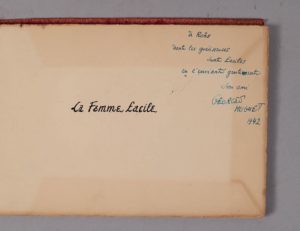 HUGNET (Georges). La Femme facile. Paris, Editions Jeanne Bucher, 1942. In-12 oblong en feuilles, sous couverture illustrée à rabats ÉDITION ORIGINALE. Frontispice et illustrations dans le texte, le tout lithographié, par Christine BOUMEESTER & Henri GOETZ. Tiré à 115 exemplaires, celui-ci (n° 56), un des100 sur vergé d'Arches. ENVOI DE L'AUTEUR sur le faux-titre : «à Robs dont les guérisseuses sont faciles en l'enviant gentiment son ami Georges Hugnet 1942». Couverture accidentée.