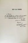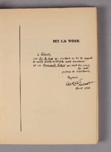 HUGNET (Georges). Ici la Voix. S. l. [Paris], Seghers, n. d. [1954]. In-4° broché, couverture illustrée. ÉDITION ORIGINALE. Couverture sur fond jaune et un portrait sur double-page par PICASSO ; un portrait dans le texte par HUGNET. Tiré à 667 et quelques exemplaires, celui-ci («Exemplaire R.-J. Godet»), sur vergé de Hollande à grandes marges comportant une illustration sur double-page en frontispice par PICASSO. ENVOI DE L'AUTEUR sur le faux-titre «à Robert [J. GODET], cet Ici la Voix qui éveillera en lui le rappel de notre fraternité et de noirs souvenirs ; et ces Revenants Futurs qui sont les vrais, les seuls pèmes de résistance, toujours. Georges Hugnet Avril 1954» Exemplaire non coupé.