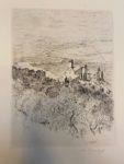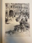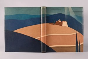 PÉRATÉ (André). Assise. S. l. [Paris], Éditions Albert Morancé, 1926. 3 volumes in-4° dont un premier pour le texte en maroquin bleu turquoise janséniste, dos lisse, tête dorée, couverture conservée ; un deuxième pour les dessins originaux en maroquin bleu turquoise, large décor personnalisé et mosaïqué avec teinture d'argent ornant les plats, dos lisse, tranches dorées, doublure et garde de soie brodée bleue, chemise à rabats en demi-maroquin turquoise, étui ; et un troisième pour les suites, sous chemise en demi-maroquin turquoise, étui (Creuzevault) Eaux-fortes par Paul Adrien BOUROUX. Tiré à 276 exemplaires, celui-ci EXEMPLAIRE UNIQUE SUR JAPON IMPÉRIAL, signé par l'artiste, contenant, dans un deuxième volume, les 40 DESSINS ORIGINAUX SIGNÉS et, dans un troisième volume, DEUX SUITES SUPPLÉMENTAIRES DES ILLUSTRATIONS (dont une des premiers états et l'autre sur japon impérial), chacune signée par l'artiste. Dos passé pour le volume de texte, et dos des chemises passés pour les deux autres.