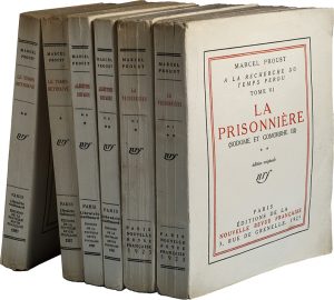 PROUST (Marcel). À la recherche du temps perdu. Tome VI. La Prisonnière. (2 vol.). — Tome VII. Albertine disparue. (2 vol.). — Tome VIII. Le Temps retrouvé. (2 vol.). Paris, Gallimard, 1923-1927. 6 volumes in-8, broché, non rogné.