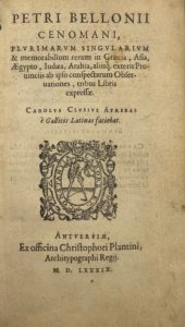 Édition originale de la traduction latine par le botaniste Carolus Clusius, de l'ouvrage de Belon du Mans Les Observations de plusieurs singularités et choses mémorables trouvées en Grèce, Asie, Judée... paru en 1553 à Paris.