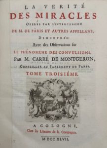 Célèbre recueil de dissertations et descriptions des miracles, chacun avec une pagination séparée. Montgeron fut l'ardent défenseur des convulsionnaires qui se livraient à leurs extases sur la tombe du diacre Paris au cimetière de Saint Médard. Il fut enfermé à la Bastille une heure après l'apparition de cet ouvrage : « C'est le plus important et le plus curieux à consulter sur les Convulsionnaires » (Caillet, 2039).