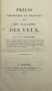 A.-P. Demours (1762- 1836) reçu médecin à la faculté de Paris en 1782 était le médecin ophtalmologue des rois Louis XVIII et Charles X. Il a fait la première opération de pupille artificielle.